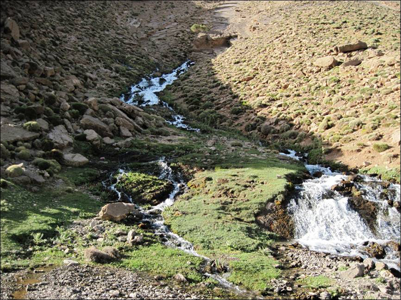 Randonnée les pieds dans l’eau ou des sentiers traversant des parcelles en terrasse, des habitations accrochées à flanc de la montagne - nuit chez l’habitant, dans la vallée des Ait Mraw, à Ighrem Akdime.